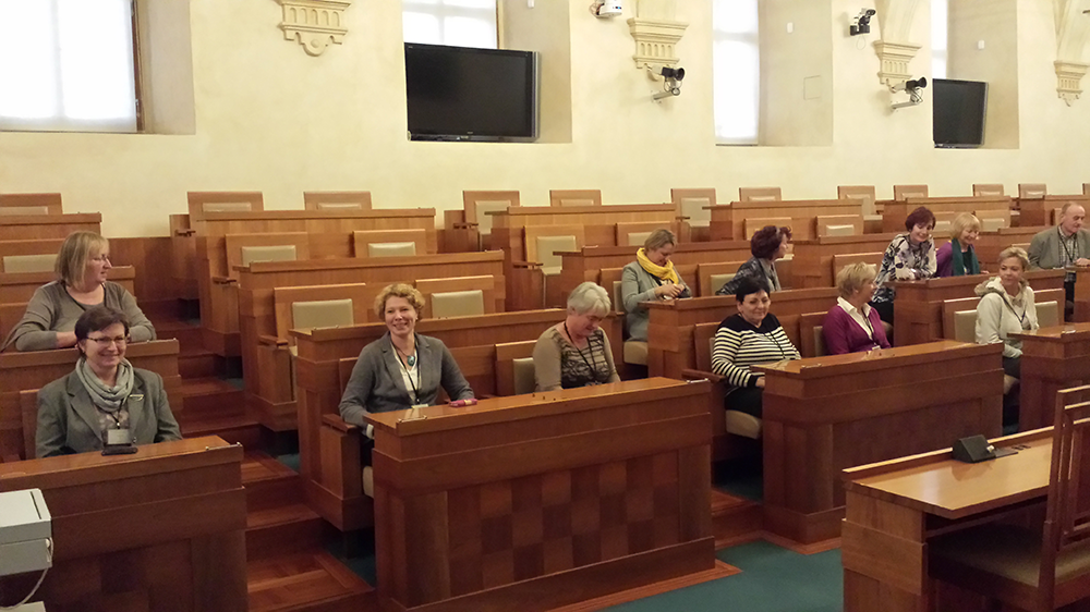 Die Begegnung begann gleich mit einem Höhepunkt: Senator Jiří Čunek hatte die deutsch-tschechische Gruppe in das Palais Wallenstein, den Sitz des tschechischen Senats, eingeladen. Er führte selbst durch Plenarsaal und Repräsentationsräume des großartigen, frühbarocken Baus und erläuterte dabei die Geschichte und das gegenwärtige politische System in Tschechien. Die Partner besichtigten auch das Klementinum, Sitz der tschechischen Nationalbibliothek, in der seit 1930 jedes in Tschechien veröffentlichte Buch gesammelt wird. Bei der Gelegenheit konnte kurz ein Abstecher zur Karlsbrücke gemacht werden, wo an einem der Tortürme das Sulzbacher Wappen eingemeißelt ist.